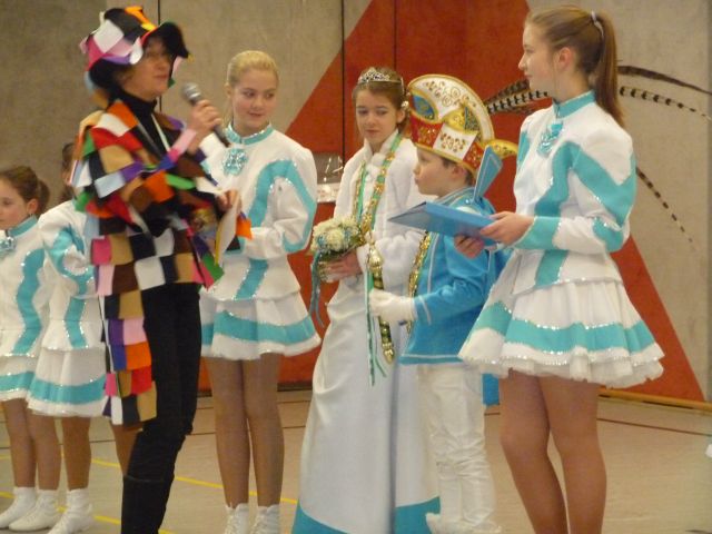 Die ganze Schule feierte an Altweiber Karneval. Los ging es mit dem Kinderprinzenpaar aus Alt-Erkrath, das mit den Hoppedötzen gekommen war. |