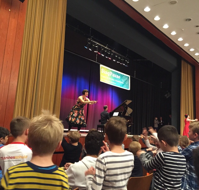 Diesmal sangen alle Klassen der Johannesschule zusammen mit den Kindern der Regenbogenschule ein Konzert in der Erkrather Stadthalle. Denn alle Kinder der Johannesschule nehmen mittlerweile an der SingPause teil, die zweimal wöchentlich von Frau Constanze Backes geleitet wird.