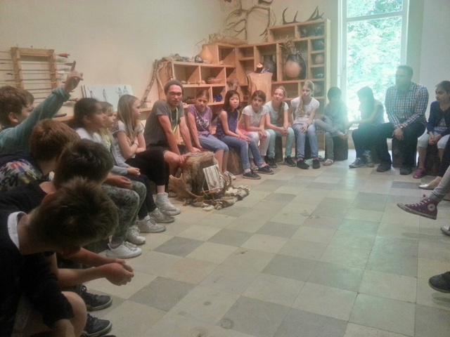 Die Klassen 4a und 4b sind im Juni 2016 zu Fuß zur Steinzeitwerkstatt im Neanderthal gelaufen. Dort angekommen hat uns ein Mitarbeiter begrüßt und in den Höhlenraum geführt. In diesem Raum ist eine riesige Höhle mit echten Überresten aus der Steinzeit: z.B. ein Knochen von einem Mammut, ein Schädel, Feuersteine und eine Waffenspitze.