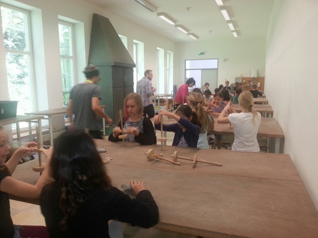 Als nächstes sind wir in den Arbeitsraum gegangen und haben Amulette hergestellt. Zunächst mussten wir ein kleines Loch in eine Holzscheibe bohren. Das war mit dem Steinzeitbohrer gar nicht so einfach. Ein Loch in eine Muschel zu machen, war wesentlich leichter. Man musste sie nur über einen Stein reiben. Zum Schluss kam noch eine Knochenperle dazu. Da war schon ein Loch drin. Wir fädelten alles auf ein Lederband und fertig war das Amulett.